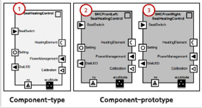 Component : VFB 수준에서 시스템을 구성할 때 사용되는 중심 구성 요소. 컴포넌트 간의 상호 작용을 위해 "Port"를 소유. Port는 정확히 하나의 컴포넌트에 속하며, 컴포넌트와 다른 컴포넌트 간의 상호 작용을 하는 지점.